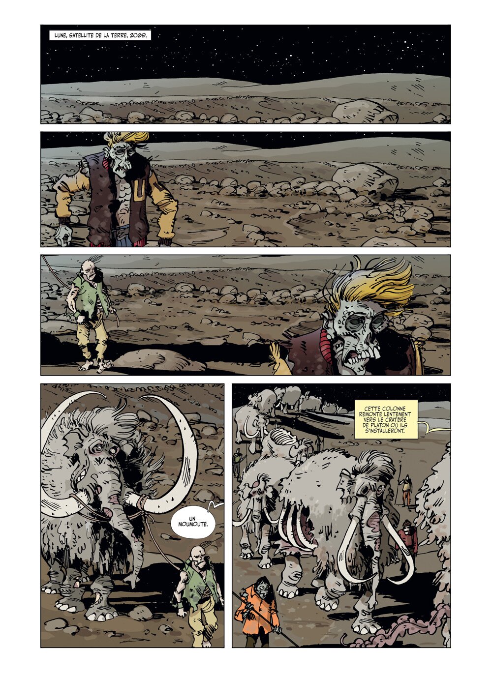Avec ses Moumoutes (Mammouths zombies), ses gros flingues et ses morts-vivants dotés de la parole nous sommes bien loin des références du genre et de leur surenchère dans l’horreur et l’hémoglobine. Les Humanos nous propose ici une BD “tout public” (les guillemets signifiants ici la toute relativité de l’étendue du public, donc nous laisserons le lecteur seul juge) qui joue avec les codes du genre pour les tourner en dérision.
